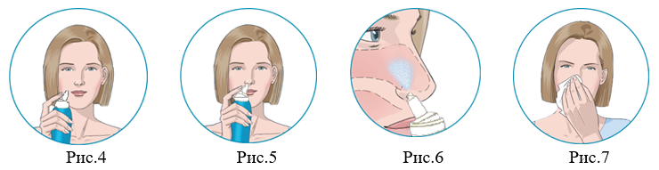 1. Снимите защитный колпачок перед использованием. При первом применении может потребоваться несколько раз нажать на анатомическую насадку до начала распыления средства. Вставьте анатомическую насадку в правую половину носа (рис.5).