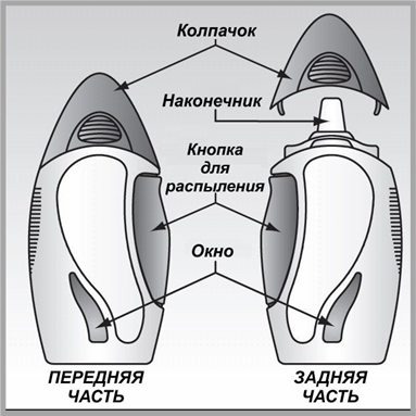 В футляре есть окно, позволяющее видеть остаток препарата во флаконе. При плотном нажатии кнопки происходит распыление суспензии через наконечник. Наконечник защищен колпачком.
