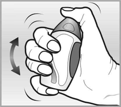 Перед первым использованием необходимо взять флакон, как показано на рис.2, поместив большой палец на колпачок, и остальные пальцы на боковую поверхность футляра, и энергично встряхнуть (не менее 10 секунд). Это очень важно, поскольку препарат во флаконе густой и становится более жидким при тщательном встряхивании.