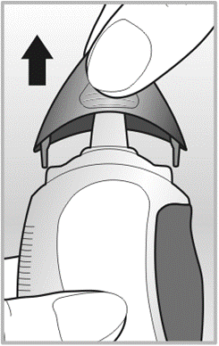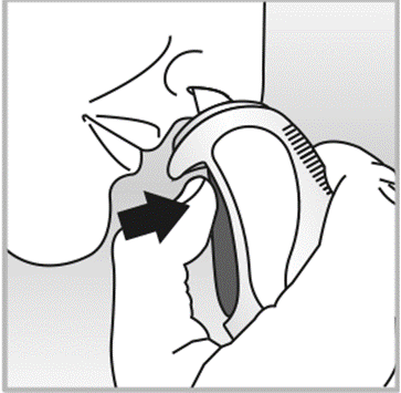 Необходимо прочистить нос (слегка высморкаться). Закрыть один носовой ход и ввести наконечник в другой носовой ход (рис. 6). Наклонить голову немного вперед, продолжая держать флакон вертикально. Затем следует начать делать вдох через нос и, продолжая вдыхать, произвести однократное нажатие пальцем кнопки для распыления препарата (рис.7). Выдохнуть через рот.