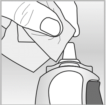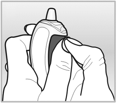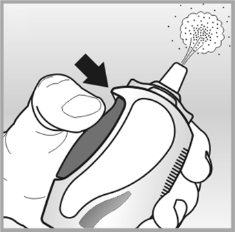 При первом использовании препарата следует проверить исправность распылителя. Направьте наконечник от себя, произведите не менее 6 нажатий, пока из наконечника не появится небольшое облачко. Нажатие следует производить большим пальцем, нажать твердо и до конца, (рис. 4). При трудности нажатия большим пальцем, можно сделать нажатие двумя руками, как показано на рис.5.