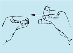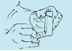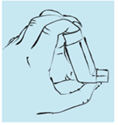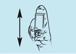 Удерживайте ингалятор в вертикальном положении (баллончик должен быть направлен дном вверх!), расположив указательный палец наверху металлического баллончика и большой палец на дне пластикового загубника. Тщательно взбалтывать вверх-вниз для равномерного перемешивания содержимого ингалятора.