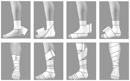 накладывать бинт на стопу от лодыжки до основания пальцев; затем бинтовать голень и бедро – снизу вверх;