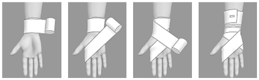 обматывать запястье и начинать делать круговые обороты вверх по руке, покрывая половину предыдущего слоя. Закрепить бинт над запястьем.