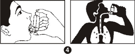 3.Сомкните губы вокруг мундштука (не кусать его) и наклоните голову немного назад. Начинайте медленно вдыхать через рот. При глубоком и сильном вдохе через мундштук нажмите на канистру, чтобы освободить одну дозу (Рис. 4).