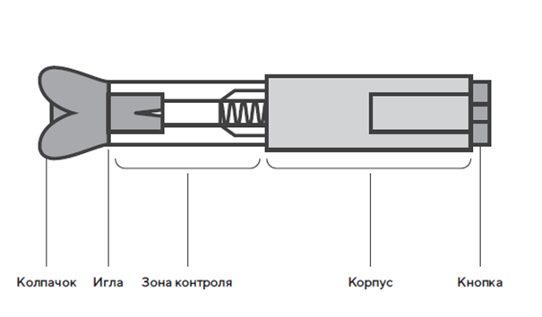 Шприц с препаратом встроен в пластиковый автоинжектор, состоящий из защитного колпачка, корпуса с прозрачной зоной контроля, верхнего корпуса и кнопки активации. Внутреннее устройство автоинжектора имеет цилиндр, защищающий иглу, и поршень, который через систему механического пуска соединен с кнопкой активации.