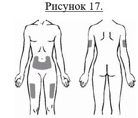 • Для каждой последующей инъекции следует использовать другой участок кожи. Каждую новую инъекцию следует выполнять на расстоянии, по крайней мере, 3 см от места предыдущей инъекции. Не вводите препарат в болезненные, ушибленные или жесткие участки кожи. Избегайте участков со шрамами или растяжками. Важно делать заметки в больничной карте пациента о том, куда именно была сделана предыдущая инъекция.)