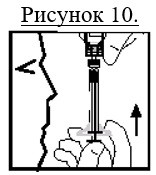 Отбор раствора Энбрел Лио из флакона с помощью шприца• С все еще присоединенным шприцем к флакону и адаптеру для флакона, удерживайте флакон вверх дном на уровне глаз. Полностью вдавите поршень в шприц (см. рисунок 10).