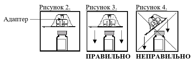 • Крепко удерживайте флакон на ровной поверхности одной рукой. С помощью другой руки нажмите СИЛЬНО ПРЯМО ВНИЗ на упаковку адаптера, пока не почувствуете, что внутренний выступ адаптера прошел сквозь пробку флакона и пока НЕ ПОЧУВСТВУЕТЕ И НЕ УСЛЫШИТЕ, ЧТО ОБОДОК АДАПТЕРА ЗАБЛОКИРОВАЛСЯ НА МЕСТЕ (см. рисунок 3). НЕ надавливайте на адаптер под углом (см. рисунок 4). Важно, чтобы внутренний выступ адаптера для флакона полностью прошел сквозь пробку флакона.