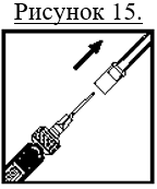 • Снимите колпачок с иглы, стянув его со шприца, при этом не дотрагиваясь до иглы и не прикасаясь иглой к какой-либо поверхности (см. рисунок 15). Будьте внимательны: не сгибайте и не перекручивайте колпачок при снятии, чтобы не повредить иглу.