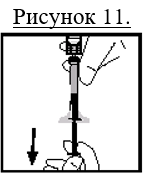 • Затем медленно потяните за поршень, чтобы набрать жидкость в шприц (см. рисунок 11). Для взрослых пациентов наберите полный объем. Для детей отберите только часть жидкости согласно указаниям лечащего врача. После того, как Вы набрали Энбрел Лио из флакона, в шприце может оставаться некоторое количество воздуха. Не беспокойтесь по этому поводу - воздух из шприца будет удален при следующем шаге.