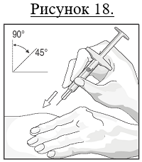 • Быстрым коротким движением полностью введите иглу в кожу под углом от 45° до 90°, как показано на рисунке 18. Будьте осторожны, чтобы не ввести иглу в кожу слишком медленно или слишком быстро.