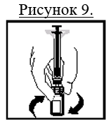 • С все еще присоединенным шприцем медленно вращайте флакон по кругу несколько раз, чтобы растворить порошок (см. рисунок 9). Не встряхивайте флакон. Подождите, пока весь порошок не растворится (обычно занимает менее 10 минут). Раствор должен быть прозрачным или слегка опалесцирующим от бесцветного до светло-желтого или палево-коричневого цвета. Некоторое количество белой пены может оставаться во флаконе. Это является нормальным явлением. Если во флаконе в течение 10 минут растворился не весь порошок, не используйте этот флакон и начните заново с другим набором.
