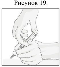 • Когда игла полностью погружена в кожу, отпустите удерживаемую кожу. Свободной рукой возьмитесь за шприц возле основания, чтобы стабилизировать его. Затем медленно, с равномерной скоростью нажимайте на поршень, чтобы ввести весь раствор (см. рисунок 19).