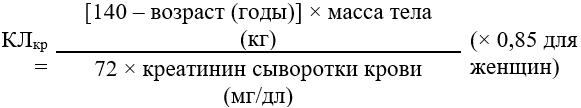 Для этого необходимо определить клиренс креатинина (КЛкр) пациента в мл/мин по содержанию креатинина в сыворотке крови (мг/дл), используя следующую формулу:
