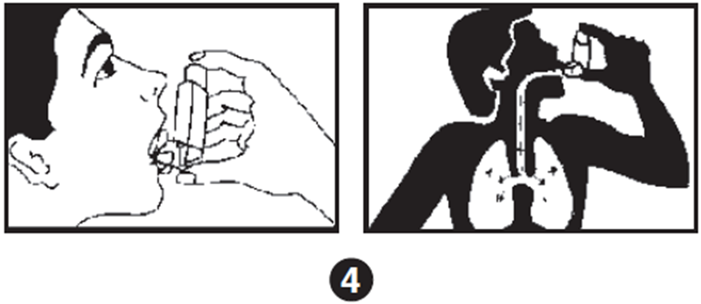4. Плотно обхватить мундштук губами и слегка наклонить голову назад. Медленно начать вдох и одновременно нажать на дно баллончика. Продолжить вдох до конца (см. рис. 4).