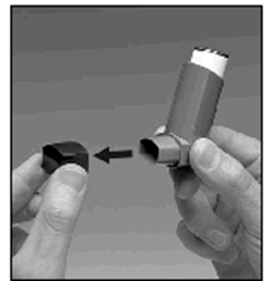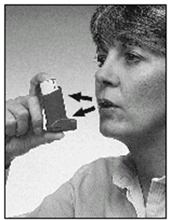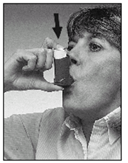 6. Сделать глубокий вдох через рот. Продолжая делать глубокий вдох, нажать на верхнюю часть ингалятора, чтобы осуществить распыление лекарственного вещества.
