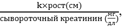 Для мужчин: = (140 - возраст [лет] х масса тела [кг]) / (72) х (0,011 х креатинин сыворотки [мкмоль/л])