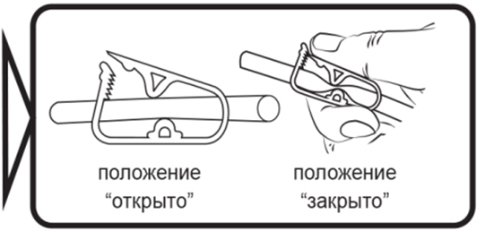 Во время проведения процедуры перевести зажим в положение «открыто», нажав пальцем на зубчастую часть фиксатора, что обеспечит свободное истечение жидкости из грелки. По окончании санитарно-гигиенической процедуры зажим перевести в положение «закрыто».