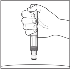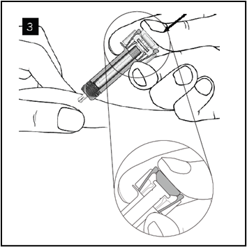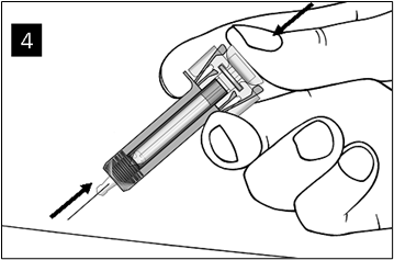 Придерживая шприц, как указано на рисунке, медленно нажимайте на поршень до тех пор, пока основание поршня не окажется между защитными боковыми лапками. Удерживайте нажатый до упора поршень вместе со шприцем в течение 5 секунд. |