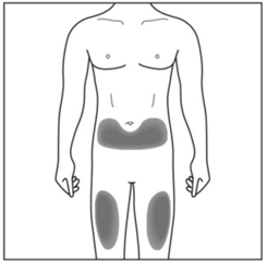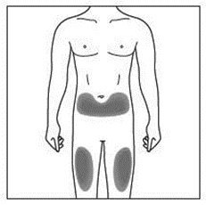 2a. Выберите место для инъекции: Рекомендуемые места располагаются на передней поверхности бедер. Вы также можете вводить препарат в нижнюю треть живота, избегая пятисантиметровой области вокруг пупка. Каждый раз меняйте места инъекции. Не следует проводить инъекции в места с поражением кожных покровов (истончение, покраснение, раздражение, уплотнение, шелушение). Избегайте введения в места с наличием рубцов и растяжек. |