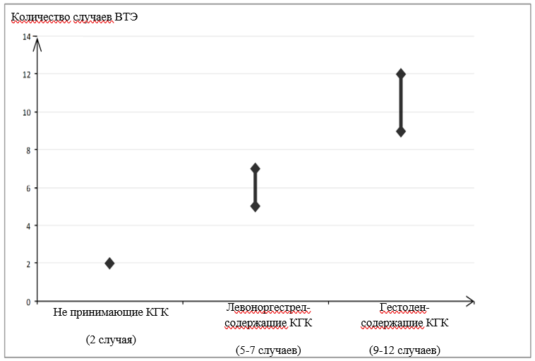 Согласно оценке, из 10000 женщин, которые применяют КГК, содержащие гестоден, у 9 - 12 в течение года развивается ВТЭ (по сравнению приблизительно с 6 случаями среди женщин, использующих левоноргестрел-содержащие КГК).
