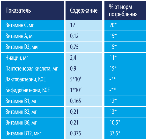 Очищенная вода, фруктоза, мальтодекстрин, фруктоолигосахариды, Lactobacillus acidophilus LA14, Bifidobacterium Longum BB536, инулин, L-аскорбиновая кислота (витамин С), ароматизатор "Ягоды", консервант сорбат калия, лимонная кислота (регулятор кислотности), консервант бензоат натрия, никотинамид (ниацин) (Витамин РР), магниевые соли жирных кислот (агент антислеживаю- щий), Д-пантотенат кальция (пантотеновая кислота), диоксид кремния (агент антислеживающий), ретинол ацетат (Витамин А), Пиридоксин гидрохлорид (Витамин Вб), рибофлавин (Витамин В2), тиамин мононитрат (Витамин В1), цианокабала- мин (Витамин В12),холекальциферол (Витамин D3).