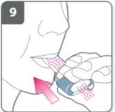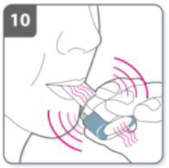 Обратите внимание: Во время вдоха через ингалятор капсула вращается, и Вы можете слышать дребезжание. Вы почувствуете сладкий привкус, как только лекарство начнет проникать в Ваши легкие. Если Вы не слышите дребезжания: капсулу может заклинить в камере. Если это произойдет: Откройте ингалятор и осторожно освободите капсулу, постукивая по основанию ингалятора. Не нажимайте на боковые кнопки. Снова вдохните лекарство, повторив пункты 8 и 9. |