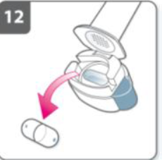 Задержите дыхание: После того, как Вы вдохнули лекарство: Задержите дыхание, как минимум на 5 – 10 секунд или на сколько сможете, не чувствуя неудобства, одновременно вынимая мундштук изо рта. Затем сделайте выдох. Откройте ингалятор и проверьте, остался ли в капсуле порошок. Если в капсуле остался порошок: Закройте ингалятор. Повторите пункты 8, 9, 10 и 11. Как правило, достаточно 1-2 ингаляций для полного освобождения капсулы. Дополнительная информация У некоторых пациентов сразу после проведения ингаляции может начаться непродолжительный кашель. Если это произошло, не волнуйтесь. Если капсула пустая, вы получили достаточное количество препарата. |