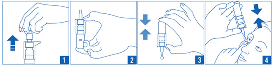 5. Для закапывания средства один раз нажмите на флакон (рис. 4). Благодаря специально разработанному механизму флакона, при каждом нажатии выделяется одна капля. Закройте глаза и медленно поводите глазами во все стороны, чтобы раствор равномерно распределился по поверхности глаза.
