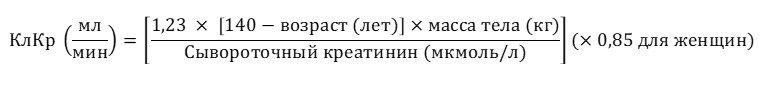 Поскольку клиренс прегабалина прямо пропорционален клиренсу креатинина, снижение дозы у пациентов с нарушением функции почек должно осуществляться в индивидуальном порядке по клиренсу креатинина (КлКр), как указано в таблице 1, и определяться по следующей формуле: