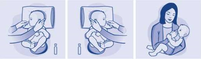 4. Поверните голову ребенка в противоположную сторону и повторите процедуру с другой ноздрей. 5. Удалите носовой аппликатор из ноздри, посадите ребенка и, удерживая его затылок, подождите несколько секунд, чтобы препарат начал действовать, затем очистите нос или используйте специальный отсос для удаления слизи.