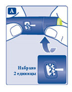 • Наберите 2 единицы препарата поворотом селектора дозы. Убедитесь, что счетчик дозы показывает «2».