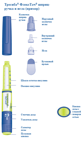 Проверьте маркировку на этикетке шприц-ручки, чтобы убедиться, что она содержит препарат Тресиба® ФлексТач® 100 единиц/мл, затем внимательно изучите представленные ниже иллюстрации, на которых показаны детали шприц-ручки и иглы.