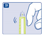 • Держа шприц-ручку иглой вверх, несколько раз слегка постучите по верхней части шприц-ручки кончиком пальца, чтобы пузырьки воздуха переместились вверх.