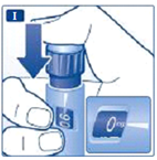 Держите шприц-ручку иглой вверх и нажимайте пусковую кнопку до тех пор, пока в индикаторном окошке напротив линии указателя дозы не появится 0 мг.