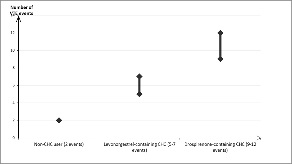 По расчетам1, из 10000 женщин, принимающих КГК, содержащих дроспиренон, у 9-12 женщин может развиться ВТЭ в течение 1 года; в сравнении с примерно 62 женщинами, использующих комбинированные гормональные контрацептивы с левоноргестрелом.